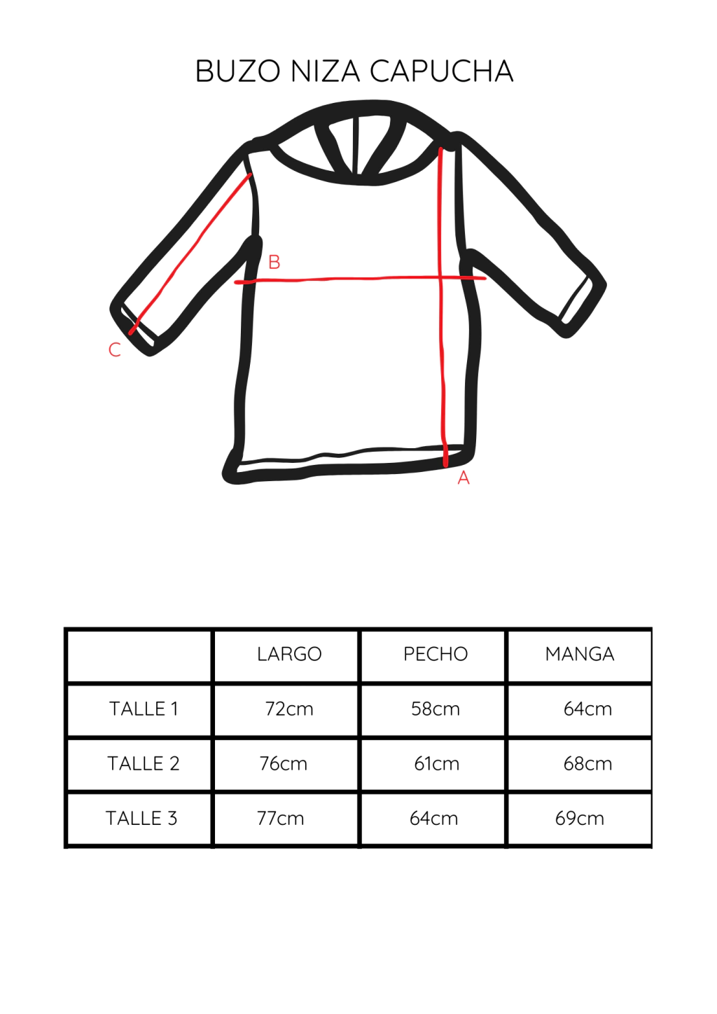 Las medidas son tomadas con la prenda en plano. Por tratarse de una confección artesanal, las dimensiones pueden variar entre 1 y 2 cm.