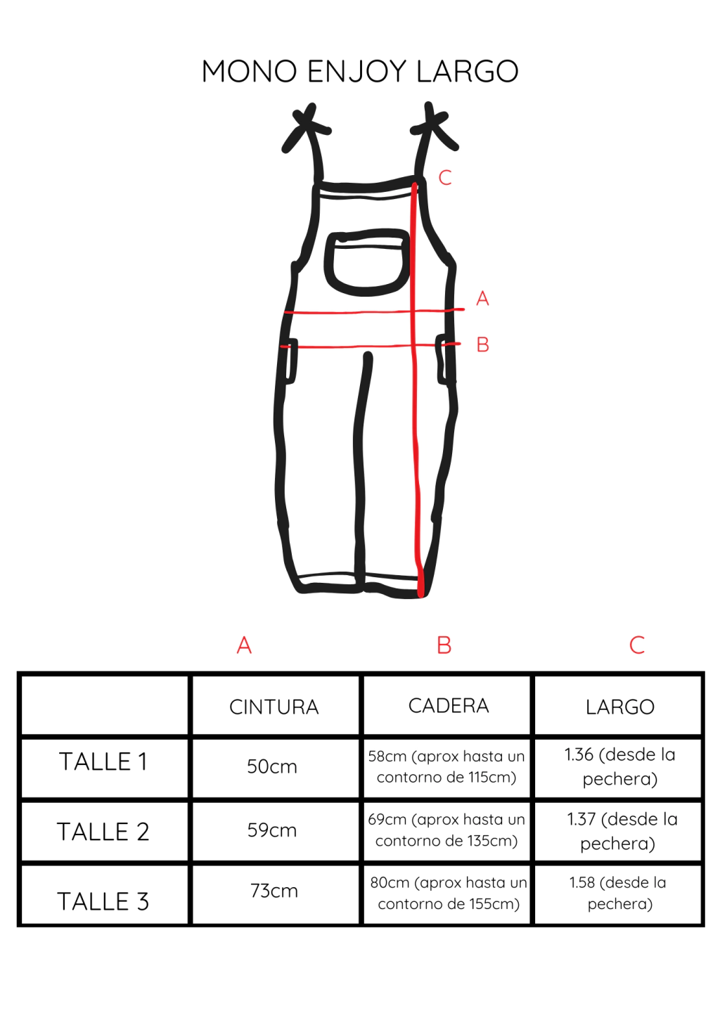 T2: cintura: 59cm., cadera: 69cm (aprox hasta un contorno de 135cm)., largo: 1.37 (desde la pechera).