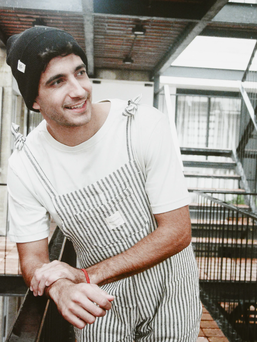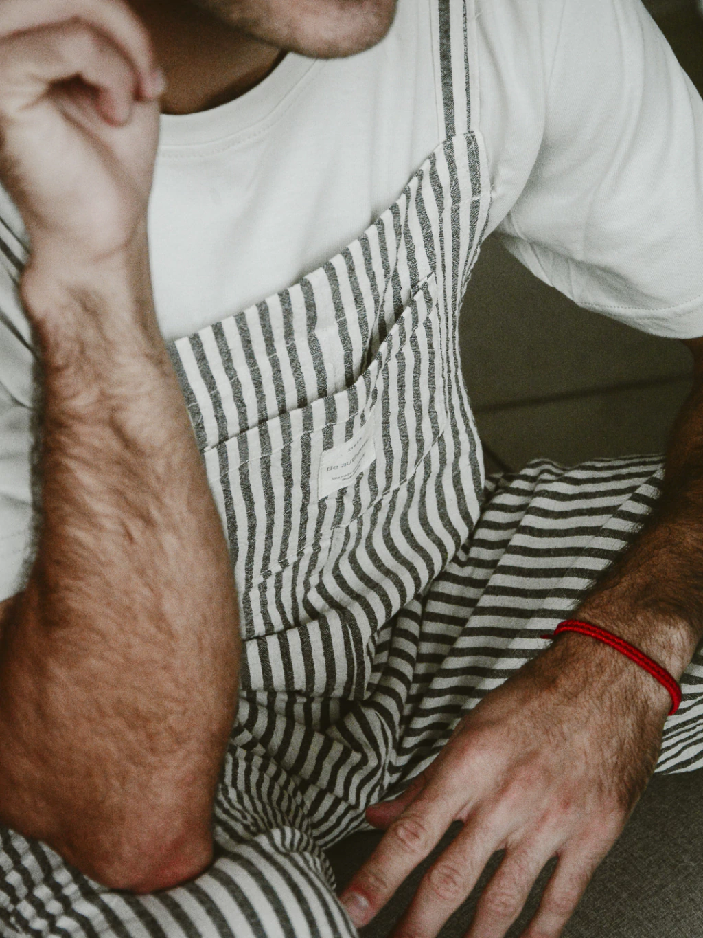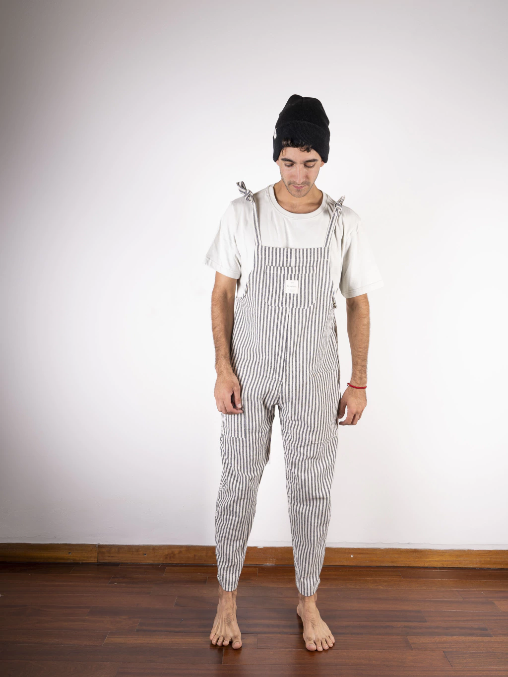 Mono Dolce Rayado Gris Men, confeccionado en lino de algodón rayado. Esta prenda única cuenta con un bolsillo frontal superior que lleva la grifa de nuestra marca, además de prácticos bolsillos frontales a la altura de la cadera y bolsillos traseros que suman funcionalidad a su diseño.