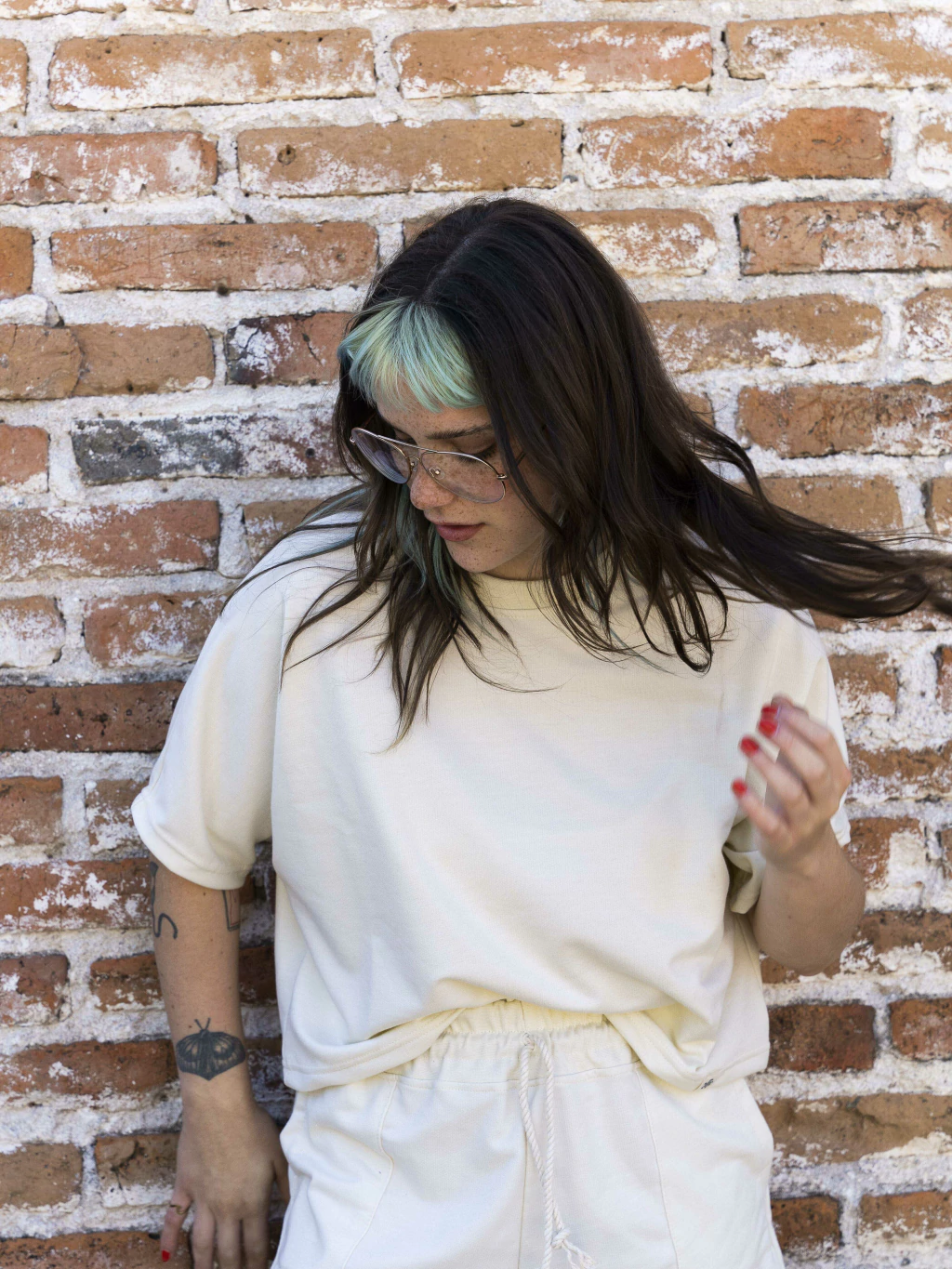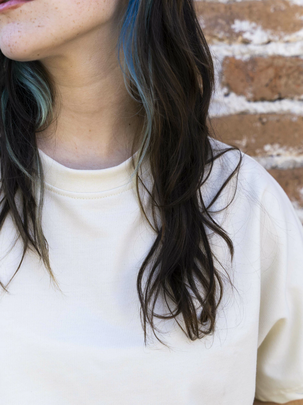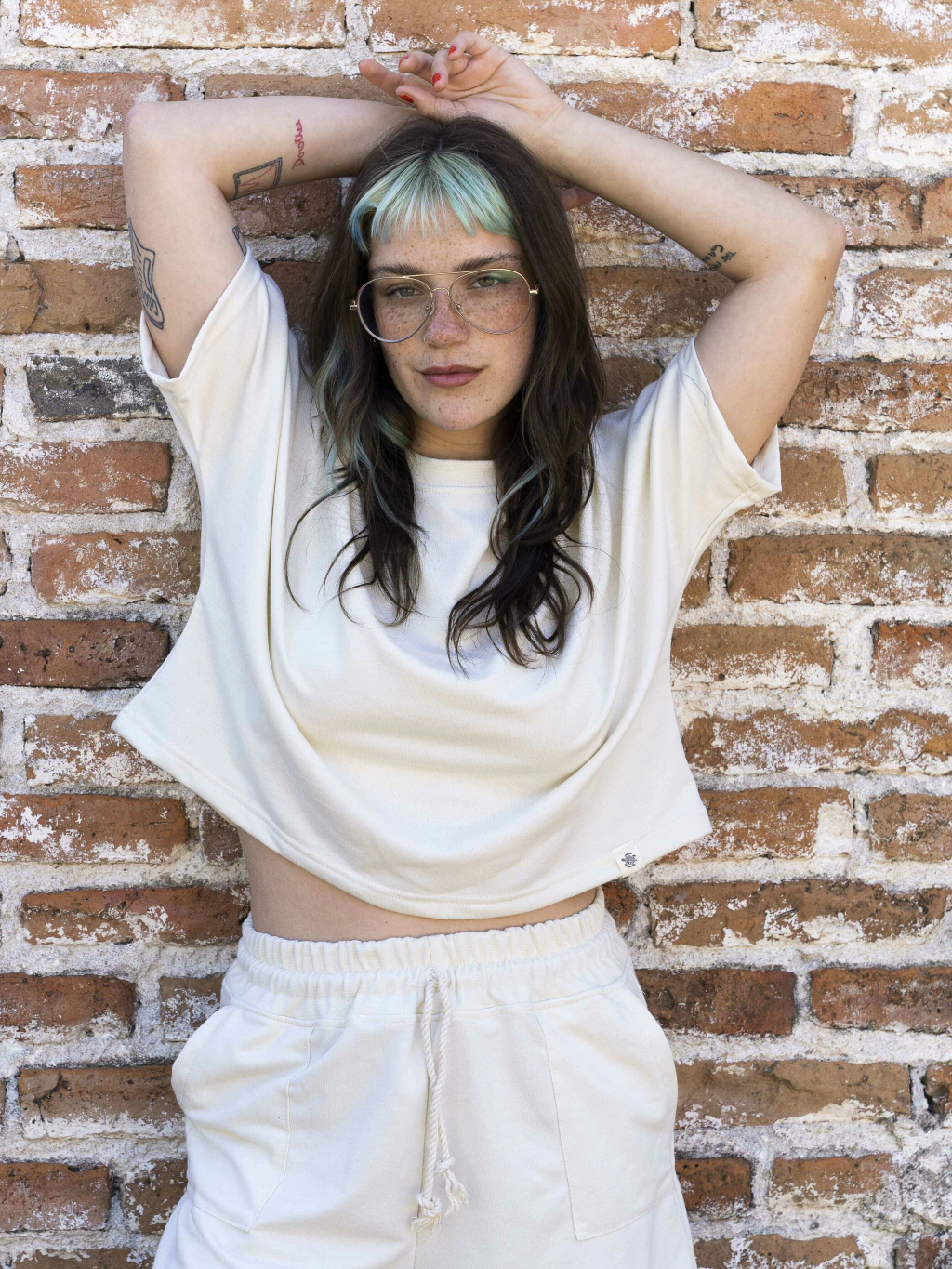 Su diseño cincluye mangas caídas, que aportan un toque relajado y moderno, perfecto para combinar con cualquier look casual. La textura del algodón rústico le da un carácter único, haciendo que cada prenda sea especial y auténtica.