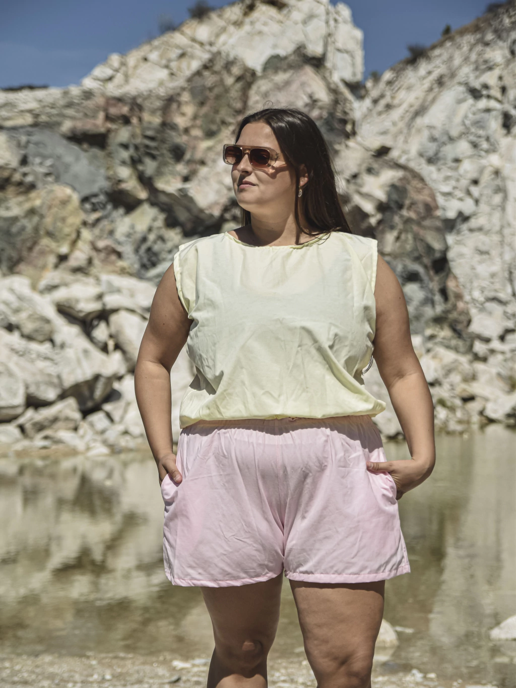 Short Capri confeccionado en poplin, una tela liviana y fresca ideal para los días cálidos. Este short cuenta con prácticos bolsillos laterales, que aportan funcionalidad sin perder estilo.