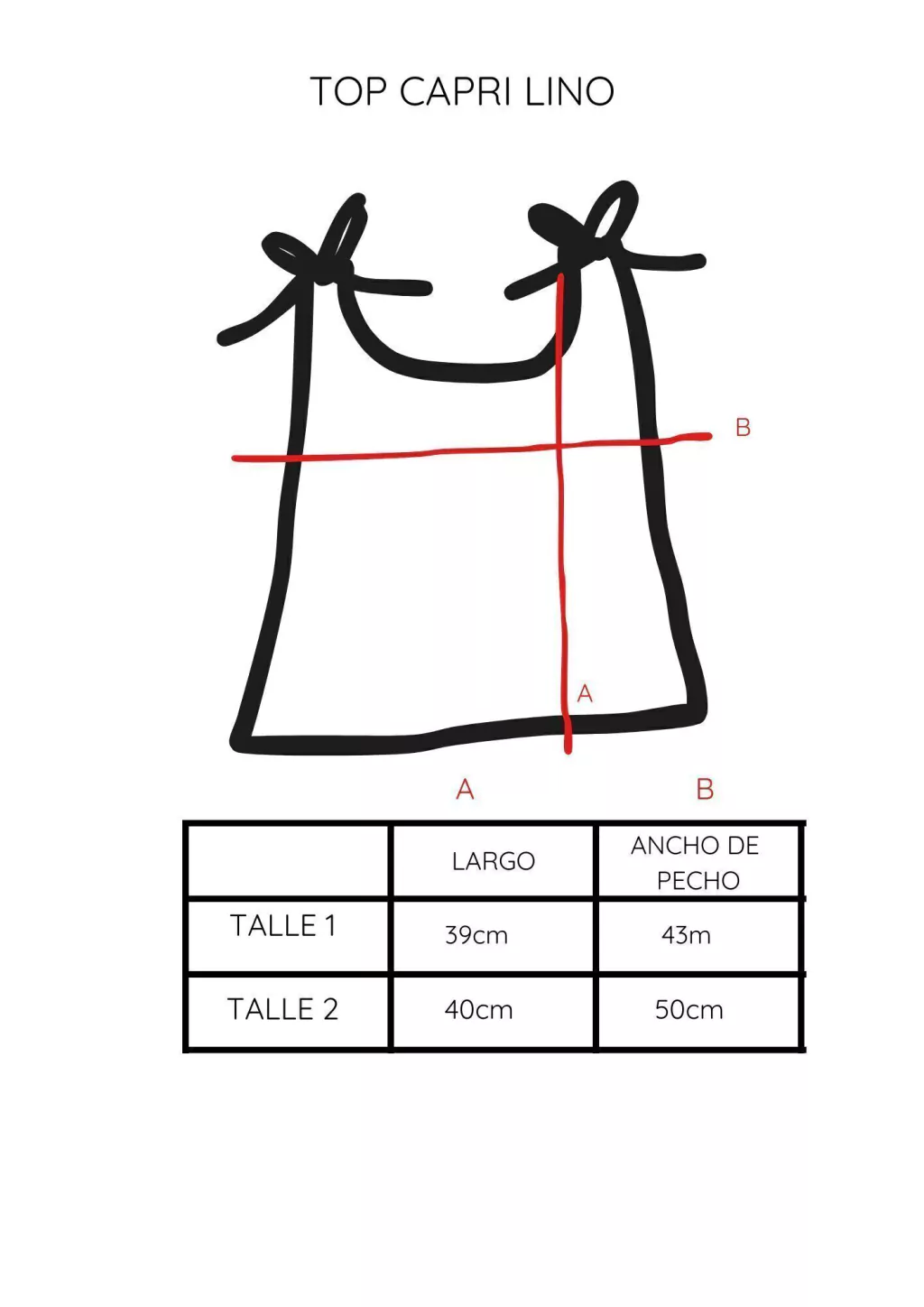 Las medidas están tomadas de frente, de lado a lado de la prenda, para que puedas elegir el talle que mejor se adapte a vos. Recordá que, al tratarse de prendas elaboradas artesanalmente, puede existir una variación de 1 a 2 cm en las medidas finales.