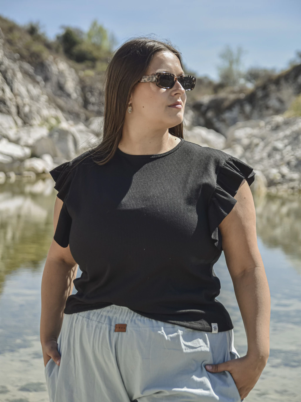 Su diseño destaca por los volados en las mangas, un detalle femenino que suma movimiento y elegancia en cada paso. Ideal para combinar con tus prendas favoritas y crear looks tanto casuales como más arreglados.