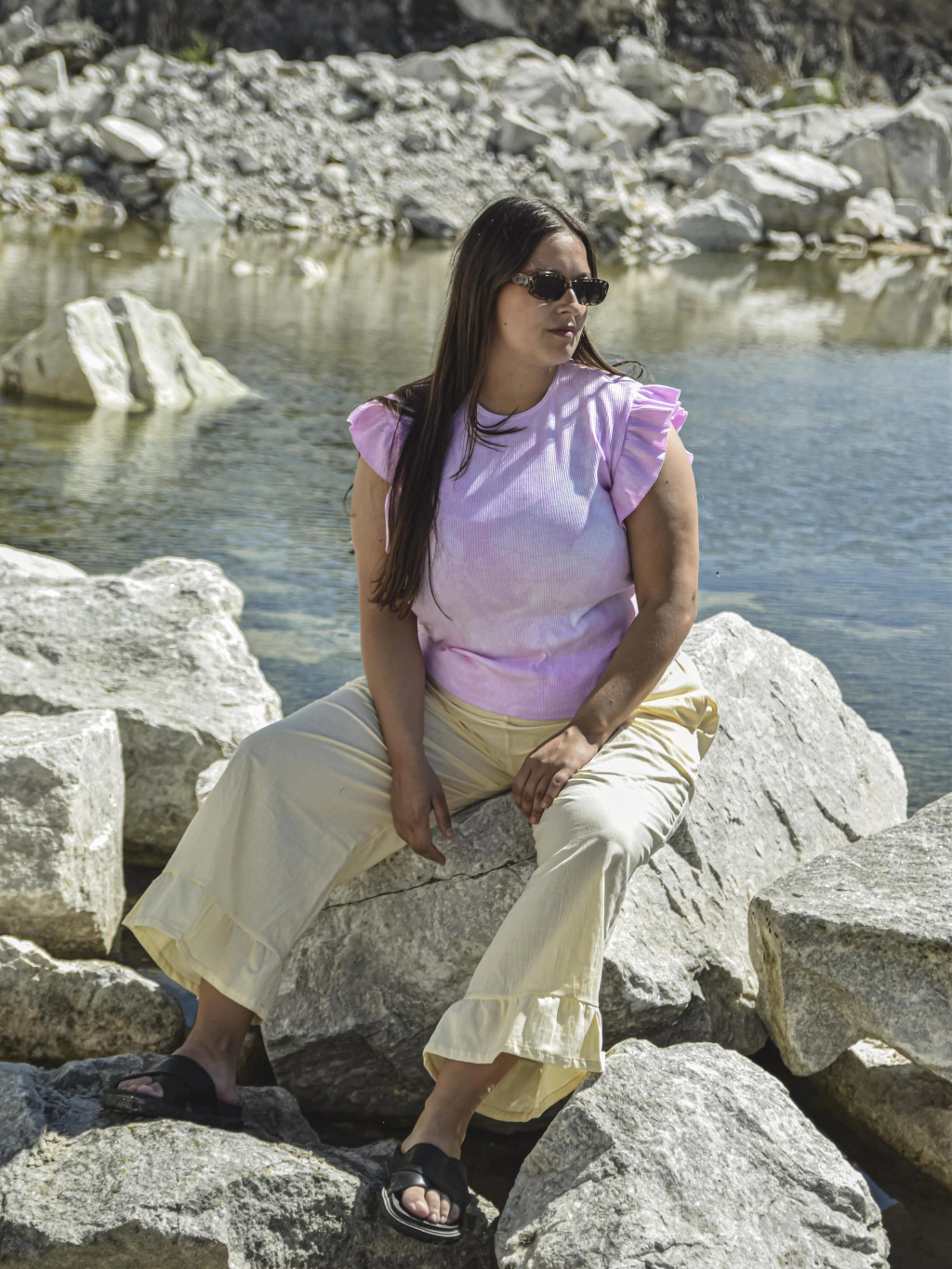 Esta musculosa está confeccionada en tela morley, un tejido suave y cómodo que se adapta perfectamente a tu cuerpo, ideal para los días de calor. Su detalle distintivo son los volados en las mangas, que le aportan un aire romántico y sofisticado, haciendo de esta prenda un imprescindible en tu guardarropa.