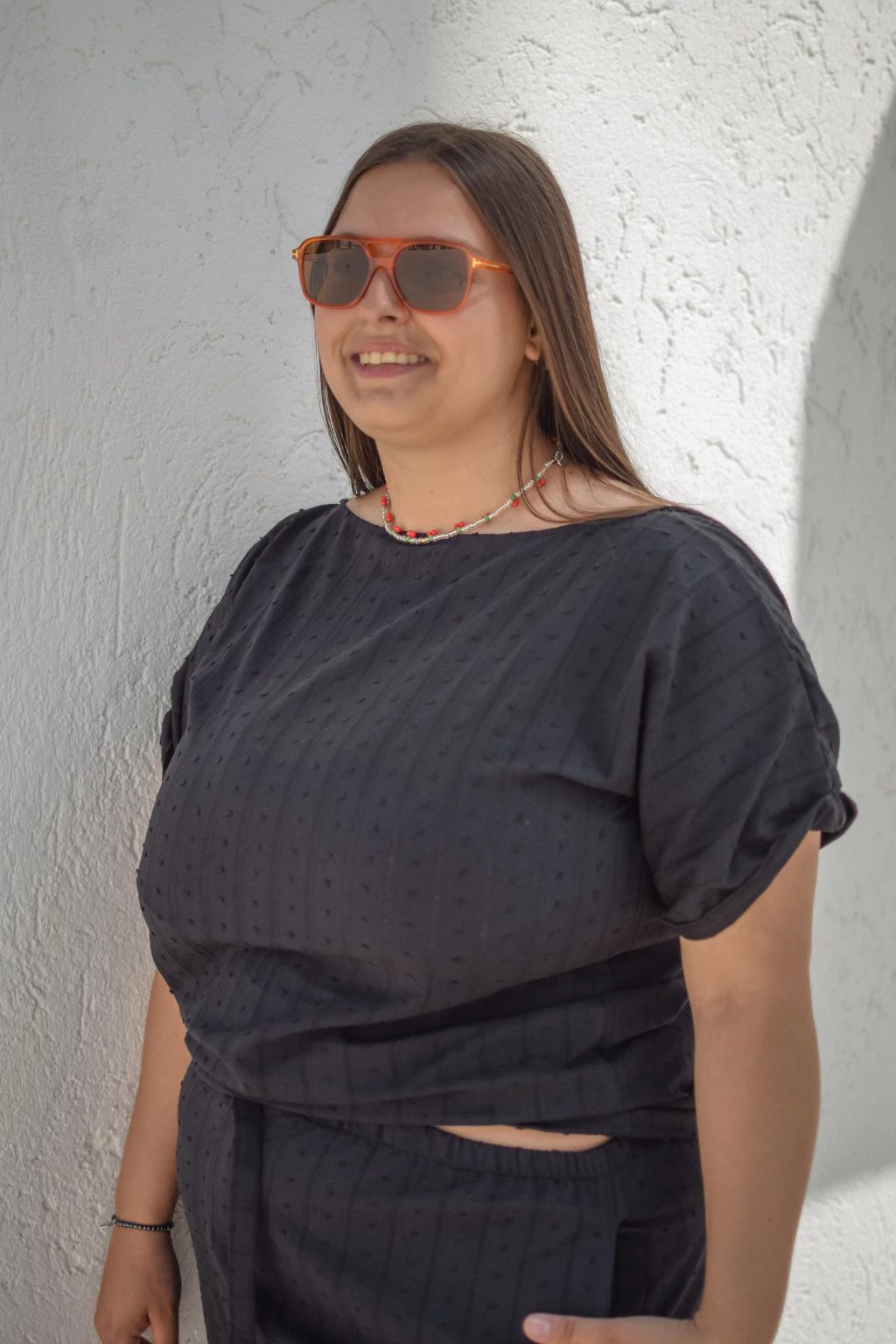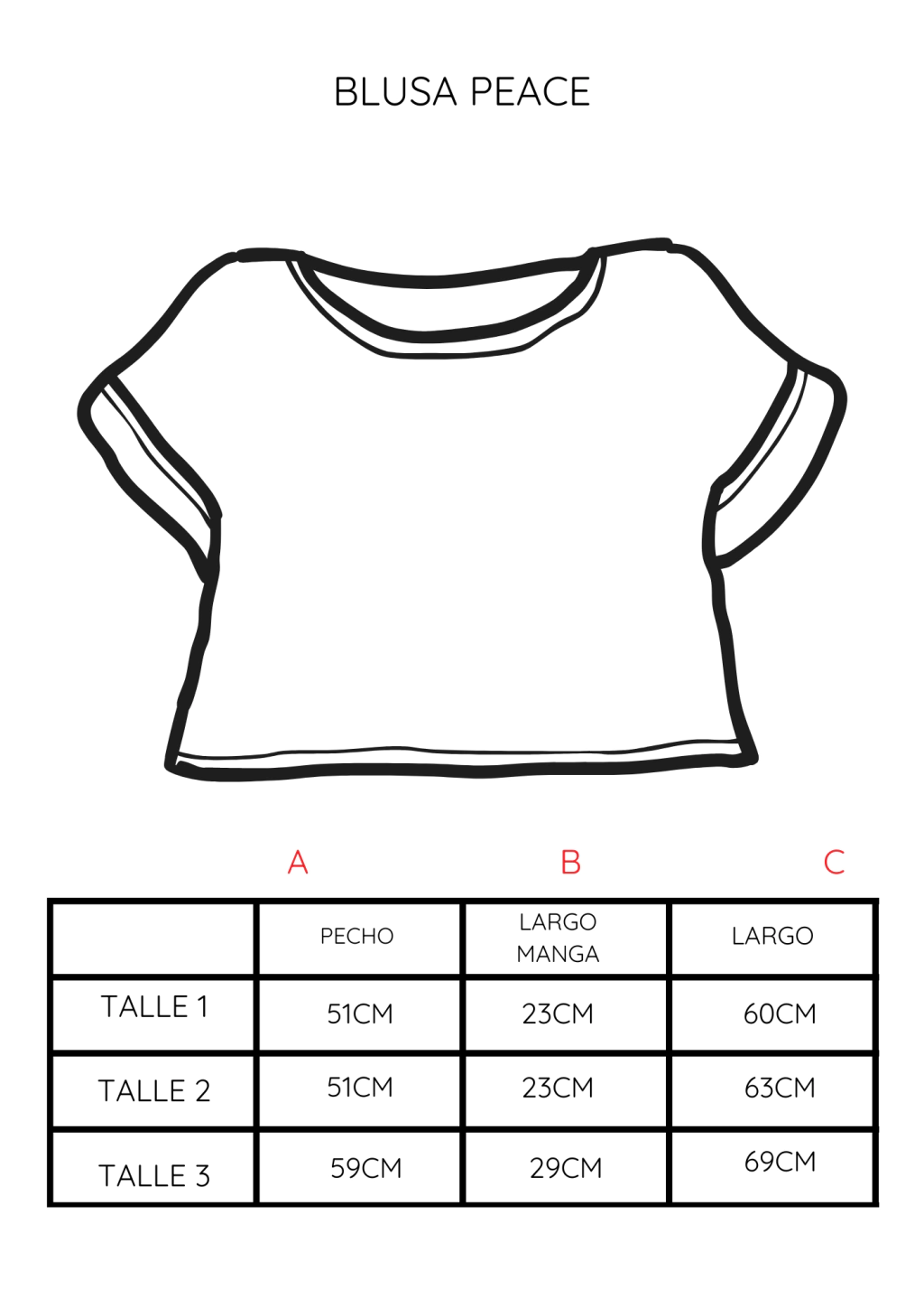 Esta blusa ofrece una caída ligera y cómoda, pensada para quienes buscan confort sin perder elegancia. Las medidas están tomadas de frente, de lado a lado de la prenda, asegurando una guía precisa para elegir el talle adecuado.