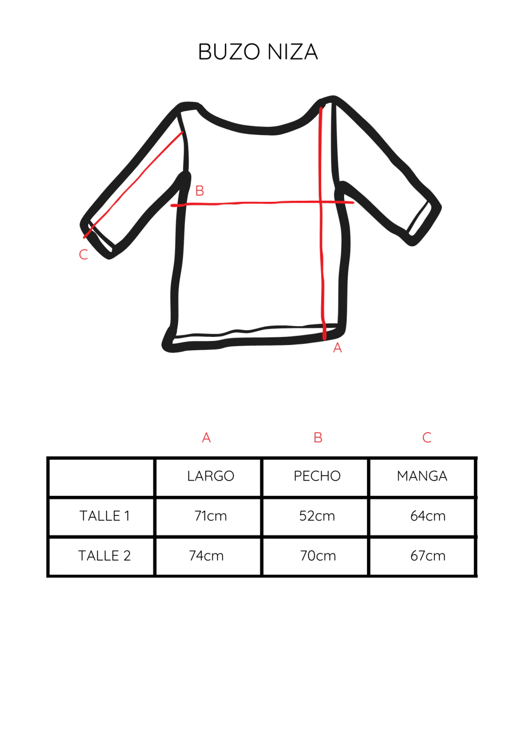 T1: largo: 71cm., pecho: 52cm., manga: 64cm.