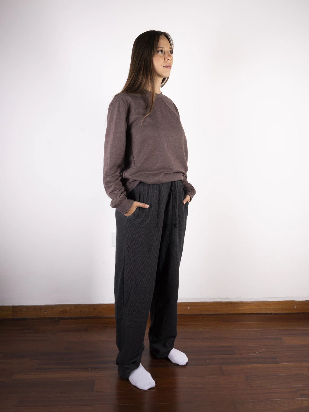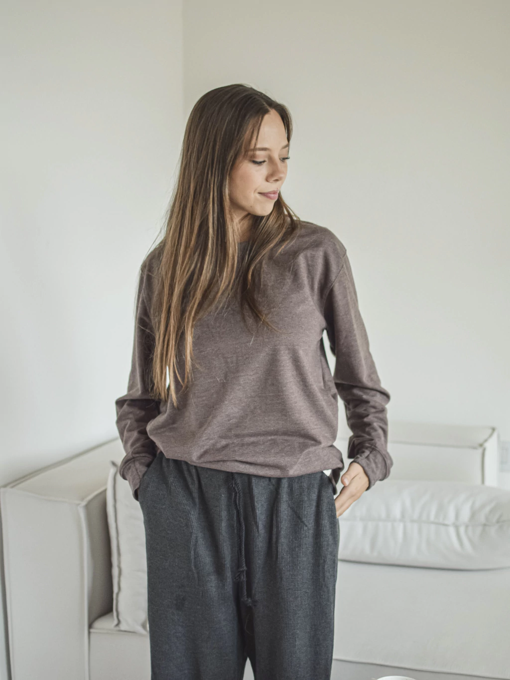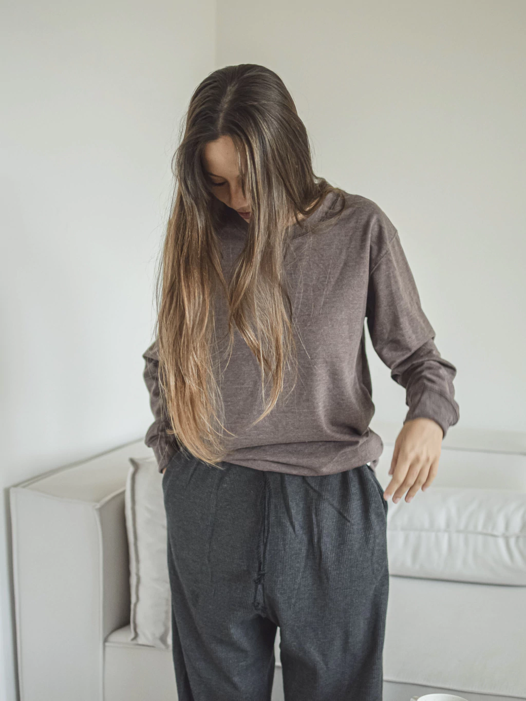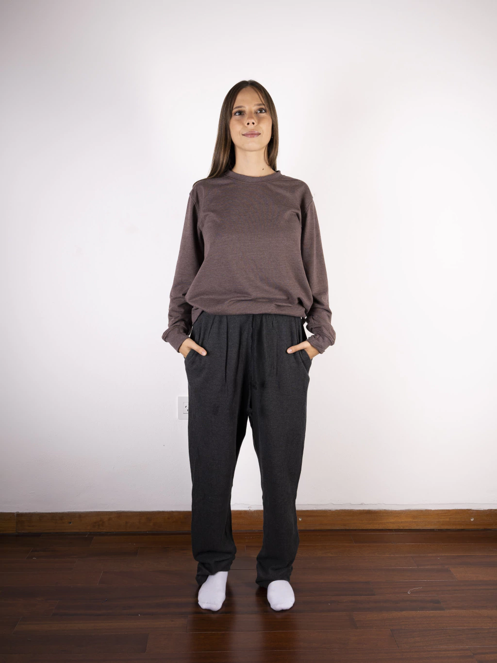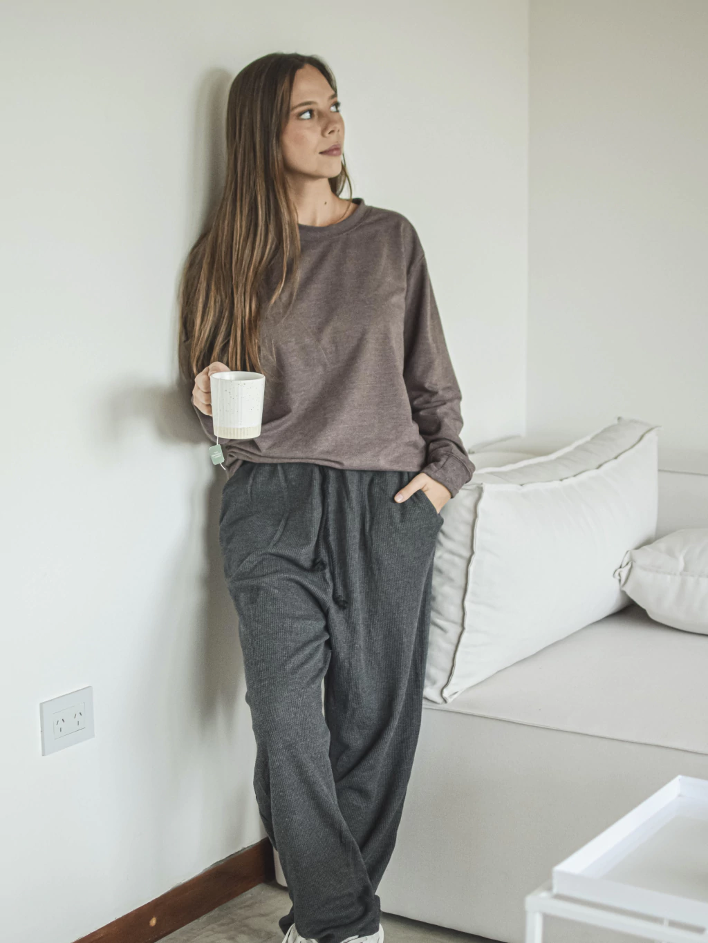 El Buzo Niza Chocolate está confeccionado en rústico de algodón, una tela liviana que nos acompaña y abriga en las tardes frescas, ideal para los primeros fríos de la temporada. Su diseño cuenta con cuello base, puños y cintura en ribb, proporcionando un ajuste cómodo y seguro que realza la silueta sin perder comodidad.