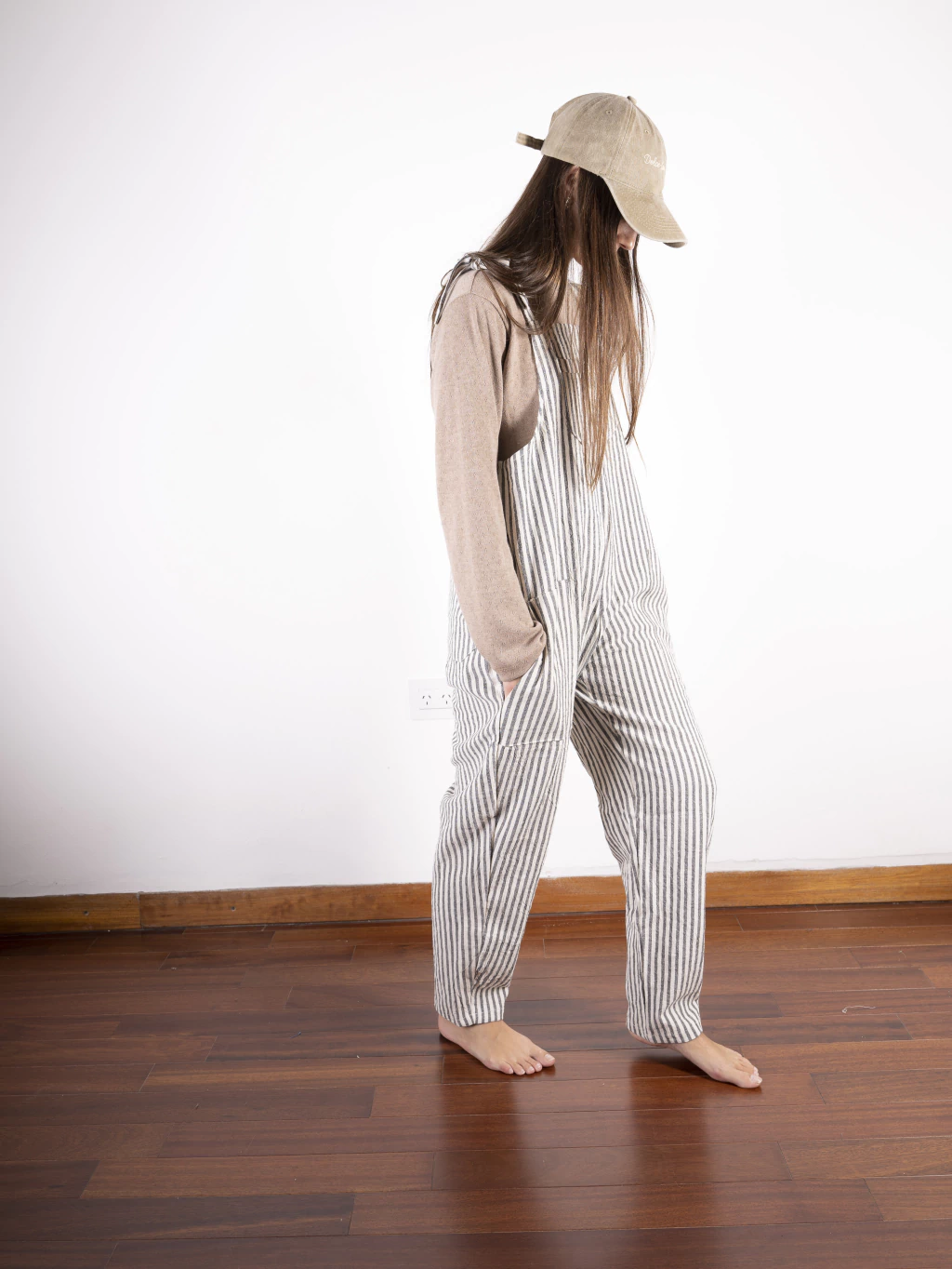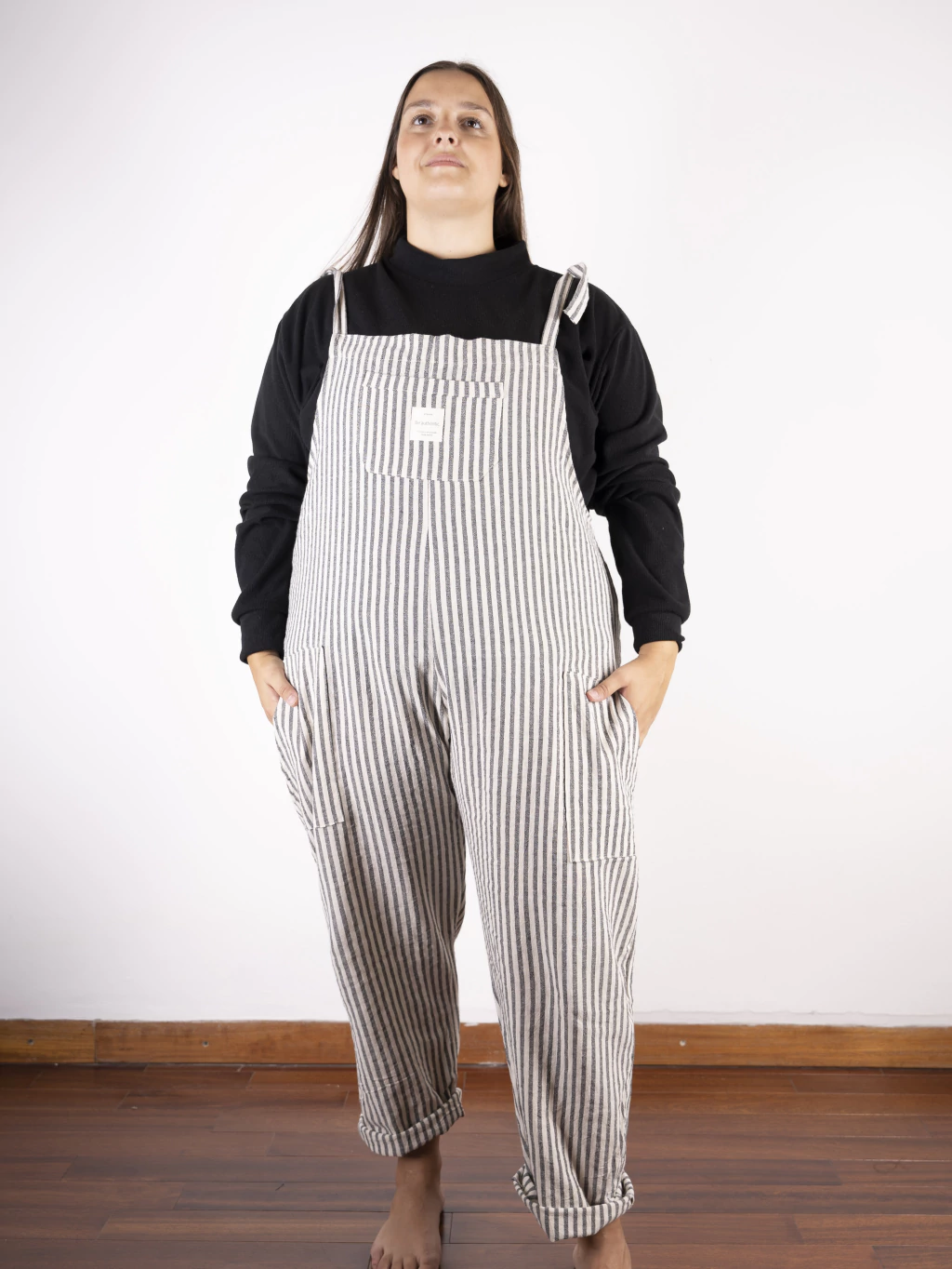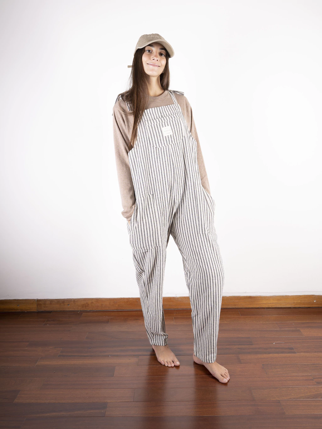 Mono Dolce Rayado Gris, confeccionado en lino de algodón rayado. Esta prenda única cuenta con un bolsillo frontal superior que lleva la grifa de nuestra marca, además de prácticos bolsillos frontales a la altura de la cadera y bolsillos traseros que suman funcionalidad a su diseño.