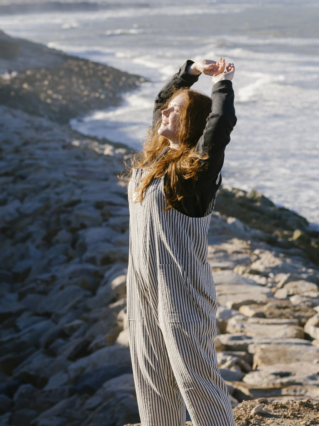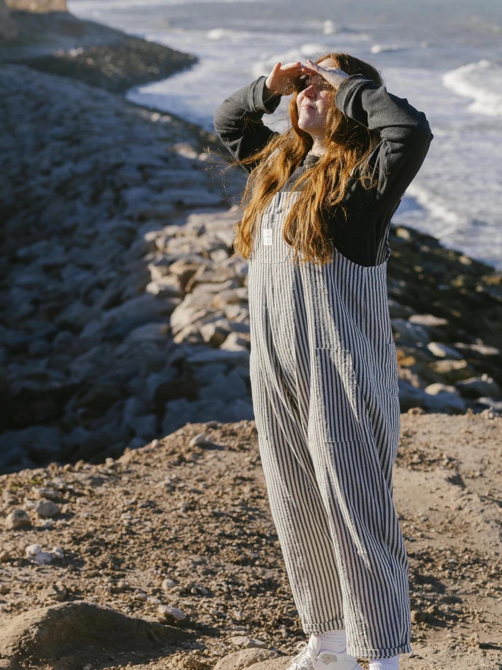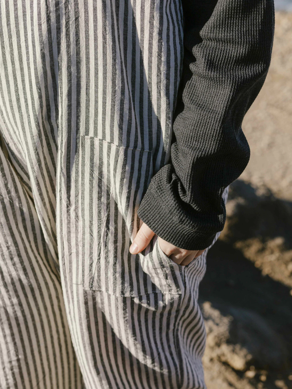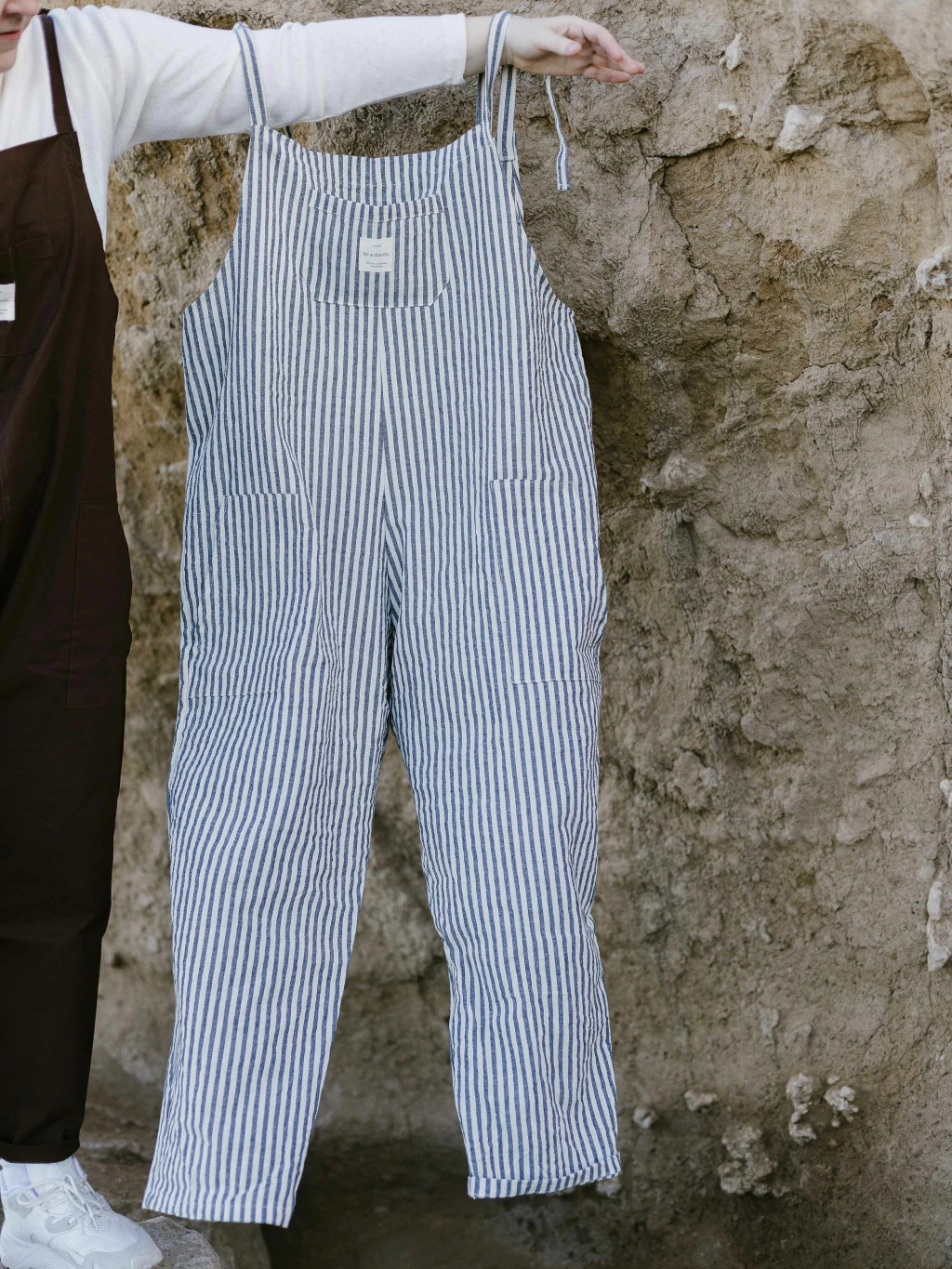 Mono Dolce Rayado Gris, confeccionado en lino de algodón rayado. Esta prenda única cuenta con un bolsillo frontal superior que lleva la grifa de nuestra marca, además de prácticos bolsillos frontales a la altura de la cadera y bolsillos traseros que suman funcionalidad a su diseño.