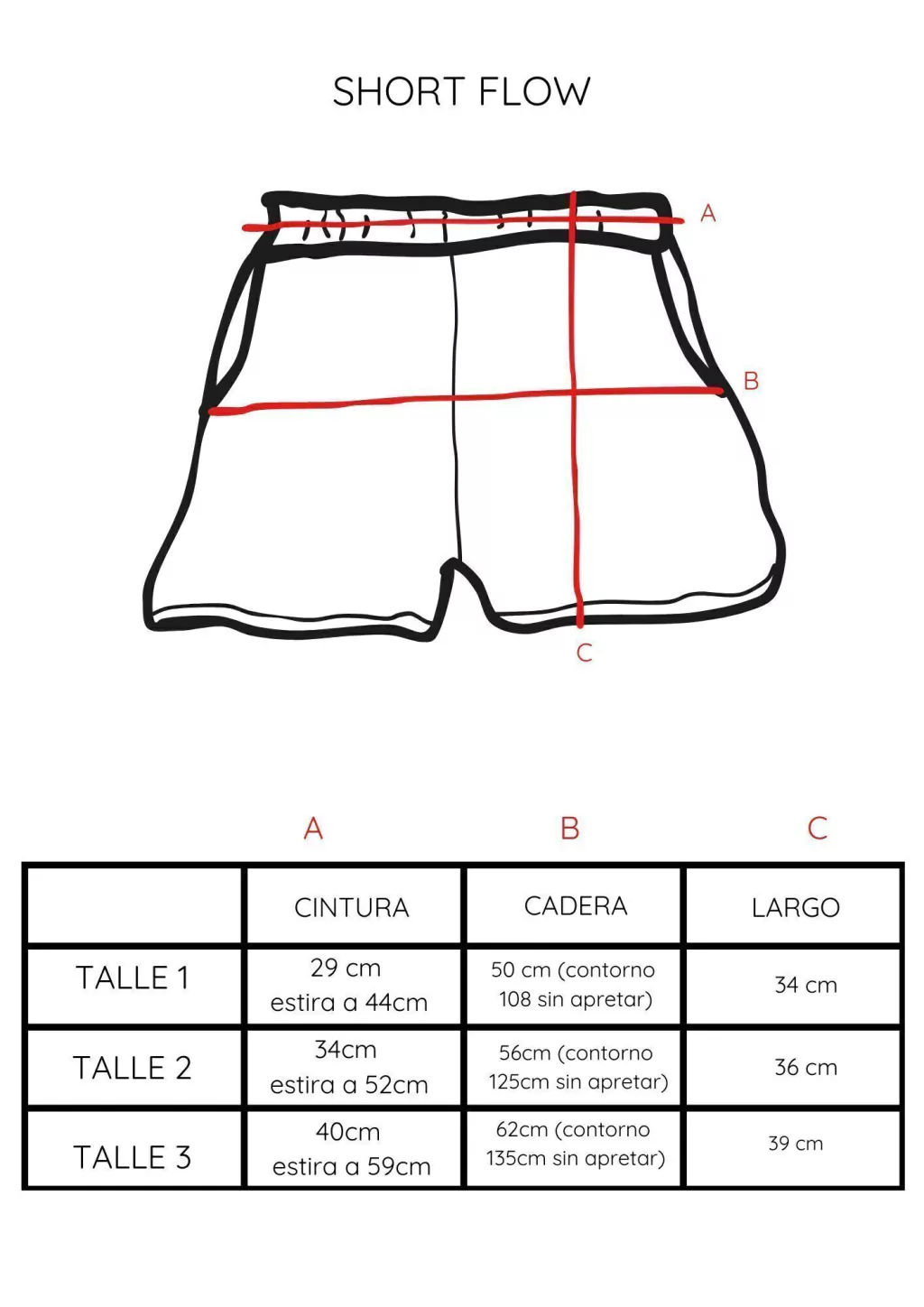T3: cintura: 40cm estira a 59cm., cadera: 62cm (contorno 135cm sin apretar)., largo:39cm.