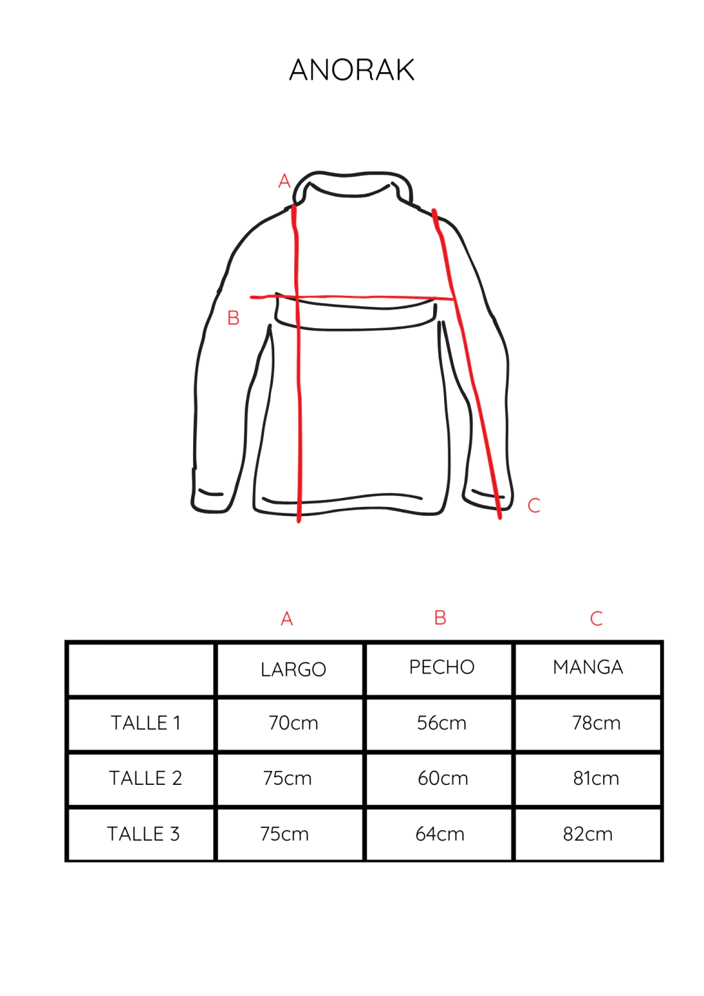 T3: largo: 75cm., pecho: 64cm, manga: 82cm.